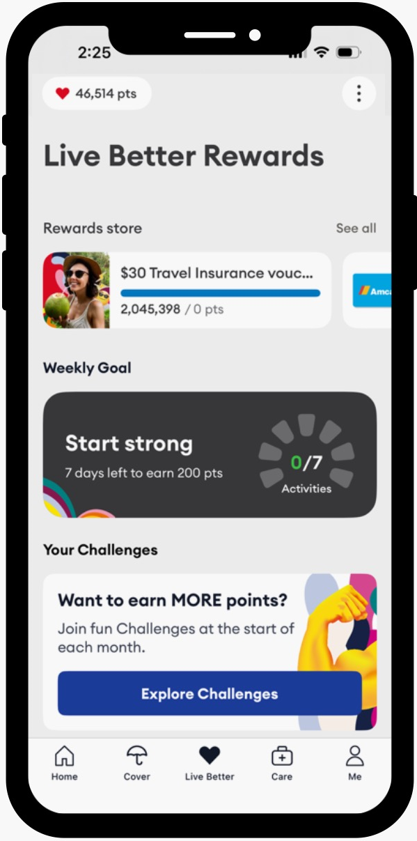 Click on the ‘Explore Challenges’ tile on the Live Better rewards home screen to find a list of all the available challenges. Click on the > button of the challenge that suits you to find the challenge info followed by ‘Join now’. Once joined, your challenge will display under the ‘Your challenges’ heading on the Live Better rewards home screen.